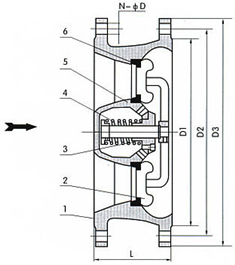 序號 零件名稱 材質(zhì) 1 閥體 GG25 2 閥盤 QA19-4 3 軸承 QA19-4 4 彈簧 SYS316 5 導流體 GG25 6 閥座 QA19-4
